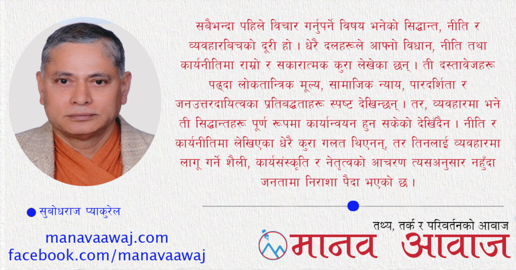 सबैभन्दा पहिले विचार गर्नुपर्ने विषय भनेको सिद्धान्त, नीति र व्यवहारबिचको दूरी हो । धेरै दलहरूले आफ्नो विधान, नीति तथा कार्यनीतिमा राम्रो र सकारात्मक कुरा लेखेका छन् । ती दस्तावेजहरू पढ्दा लोकतान्त्रिक मूल्य, सामाजिक न्याय, पारदर्शिता र जनउत्तरदायित्वका प्रतिबद्धताहरू स्पष्ट देखिन्छन् । तर, व्यवहारमा भने ती सिद्धान्तहरू पूर्ण रूपमा कार्यान्वयन हुन सकेको देखिँदैन । नीति र कार्यनीतिमा लेखिएका धेरै कुरा गलत थिएनन्, तर तिनलाई व्यवहारमा लागू गर्ने शैली, कार्यसंस्कृति र नेतृत्वको आचरण त्यसअनुसार नहुँदा जनतामा निराशा पैदा भएको छ । कुनै पनि नीति स्थिर र अपरिवर्तनीय हुँदैन । व्यवहार गर्दै जाँदा त्यसलाई सच्याउने, परिमार्जन गर्ने र समयानुकूल सुधार गर्ने प्रक्रिया आवश्यक हुन्छ । तर, त्यस दिशामा अपेक्षित लचकता र आत्मसमीक्षा देखिन नसक्दा लोकतान्त्रिक दलहरू स्वयम् आलोचनाको केन्द्र बन्न पुगेका छन् ।