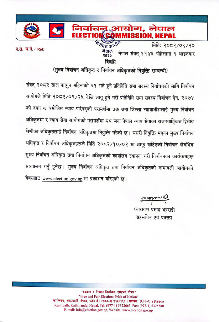 फागुन २१ गतेका लागि तोकिएको प्रतिनिधिसभा निर्वाचनका लागि आयोगले न्याय परिषद्को परामर्शमा ७७ जना जिल्ला न्यायाधीशलाई मुख्य निर्वाचन अधिकृतमा र न्याय सेवा आयोगको परामर्शमा ८८ जना नेपाल न्याय सेवाका राजपत्राङ्कित द्वितीय श्रेणीका अधिकृतलाई निर्वाचन अधिकृतमा नियुक्ति गरेको हो ।