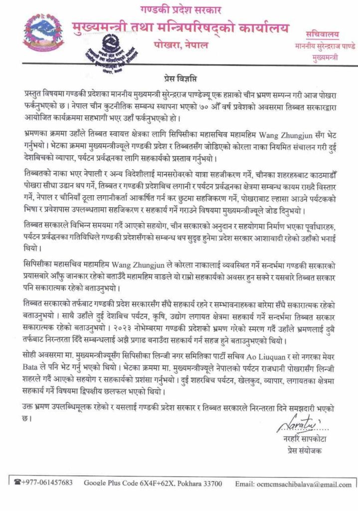 मुख्यमन्त्री पाण्डेले तिब्बत स्वायत्त क्षेत्रका लागि सीपीसीका महासचिव वाङ झोङजुनसँगको भेटमा दुई देशबिचको व्यापार र पर्यटन प्रवर्धनका लागि कोरला नाका सञ्चालन, तिब्बतको नाका हुँदै मानसरोवर यात्रा सहजीकरण, र चीनका सहरबाट पोखरासम्म सीधा उडान थप्ने आग्रह गर्नु भएको थियो ।