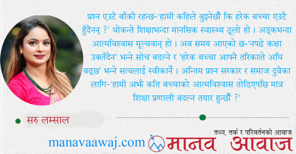 अन्ततः प्रश्न एउटै बाँकी रहन्छ-हामी कहिले बुझ्नेछौँ कि हरेक बच्चा एउटै हुँदैनन् ?” घोकन्ते शिक्षाभन्दा मानसिक स्वास्थ्य ठूलो हो । अङ्कभन्दा आत्मविश्वास मूल्यवान् हो । अब समय आएको छ-नपढे कक्षा उक्लँदैन भन्ने सोच बदल्ने र हरेक बच्चा आफ्नै तरिकाले अघि बढ्छ भन्ने सत्यलाई स्वीकार्ने । तर अन्तिम प्रश्न सरकार र समाज दुवैका लागि-हामी अझै कति बच्चाको आत्मविश्वास तोडिएपछि मात्र शिक्षा प्रणाली बदल्न तयार हुन्छौँ ?”