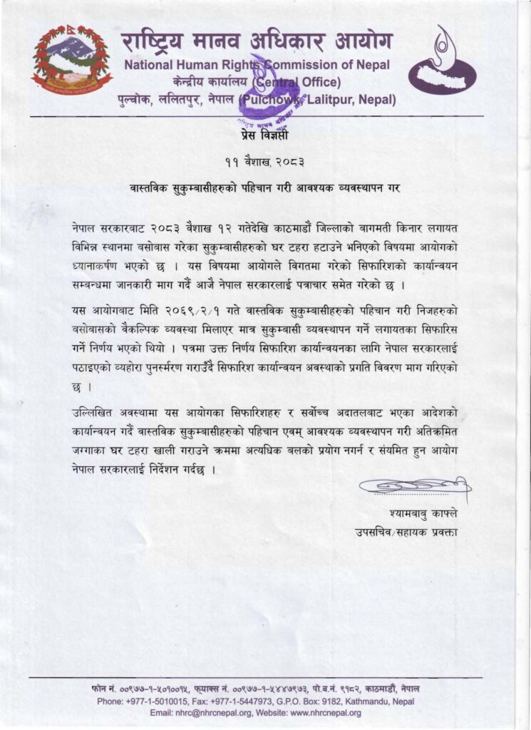 नेपाल सरकारले २०८३ वैशाख १२ गतेदेखि सुकुम्बासी बस्ती हटाउने योजना अघि बढाएको सन्दर्भमा आयोगले यसअघि दिएका सिफारिसहरूको कार्यान्वयन अवस्थाबारे जानकारी माग गर्दै सरकारलाई पत्राचार गरेको जनाएको छ ।