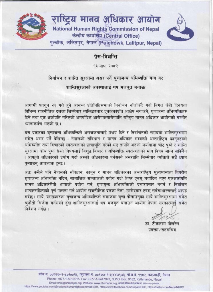 ‘आगामी फागुन २१ गते हुने आसन्न प्रतिनिधिसभाको निर्वाचन नजिकिँदै गर्दा विगत केही दिनयता विभिन्न राजनीतिक दलका जिम्मेवार व्यक्तिहरूबाट एकअर्काप्रति आक्षेप लगाउने, घृणाजन्य अभिव्यक्तिहरु दिने तथा एक अर्काप्रति गरिएको अमर्यादित आरोपप्रत्यारोपप्रति राष्ट्रिय मानव अधिकार आयोगको गम्भीर ध्यानाकर्षण भएको छ ।’-विज्ञप्तिमा उल्लेख छ ।