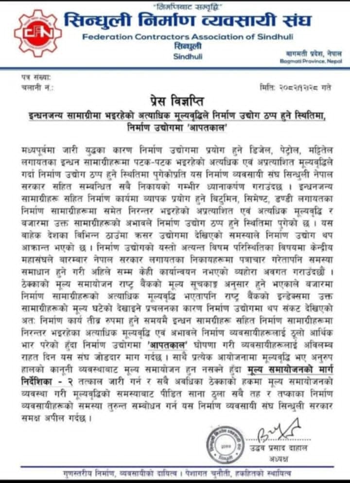 निर्माण व्यवसायी सङ्घ सिन्धुलीले इन्धनजन्य पदार्थको निरन्तर मूल्यवृद्धि र निर्माण सामग्रीको अभावका कारण देशभर निर्माण उद्योग ठप्प हुने अवस्थामा पुगेको भन्दै ‘निर्माण क्षेत्रमा आपतकाल घोषणा’ गर्न सरकारसँग माग गरेको छ ।