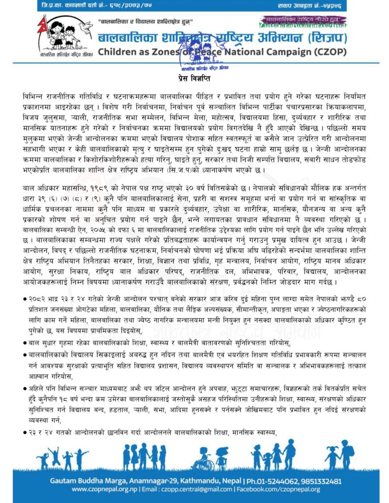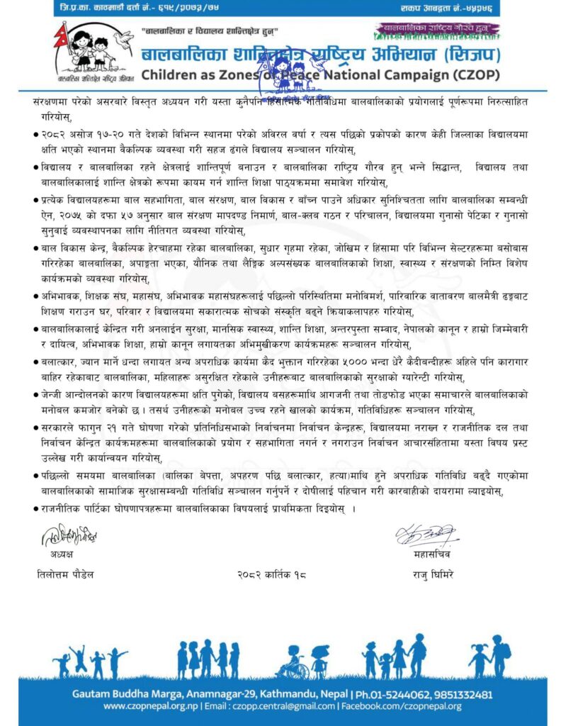 सञ्जालका अध्यक्ष तिलोत्तम पौडेलद्वारा २०८२ कात्तिक १८ गते जारी विज्ञप्तिमा निर्वाचनसहित कुनै पनि राजनीतिक गतिविधिमा बालबालिकाको प्रयोग नगर्नु पर्ने आग्रह गरिएको छ ।