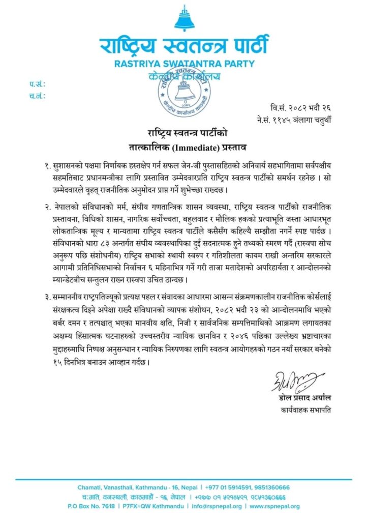 जसमा जेनजीले अघि सार्ने प्रधानमन्त्रीका उम्मेदवारलाई रास्वपाको समर्थन रहने र त्यो उम्मेदवारले बृहत् राजनीतिक अनुमोदन प्राप्त गर्ने शुभेच्छा राखिएको विषय उल्लेख छ ।