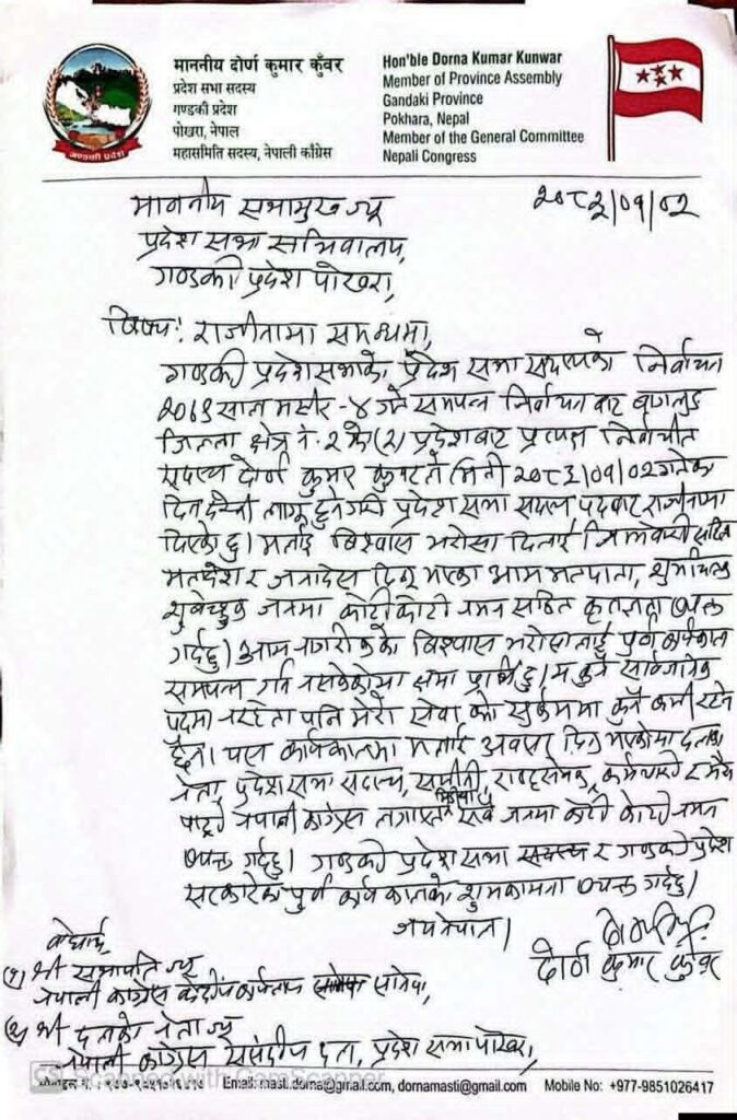 यसैबिच, मन्त्री पद नपाएपछि नेपाली कांग्रेसका गण्डकी प्रदेशसभा सदस्य द्रोर्णकुमार कुँवरले पदबाट राजीनामा दिनुभएको छ ।