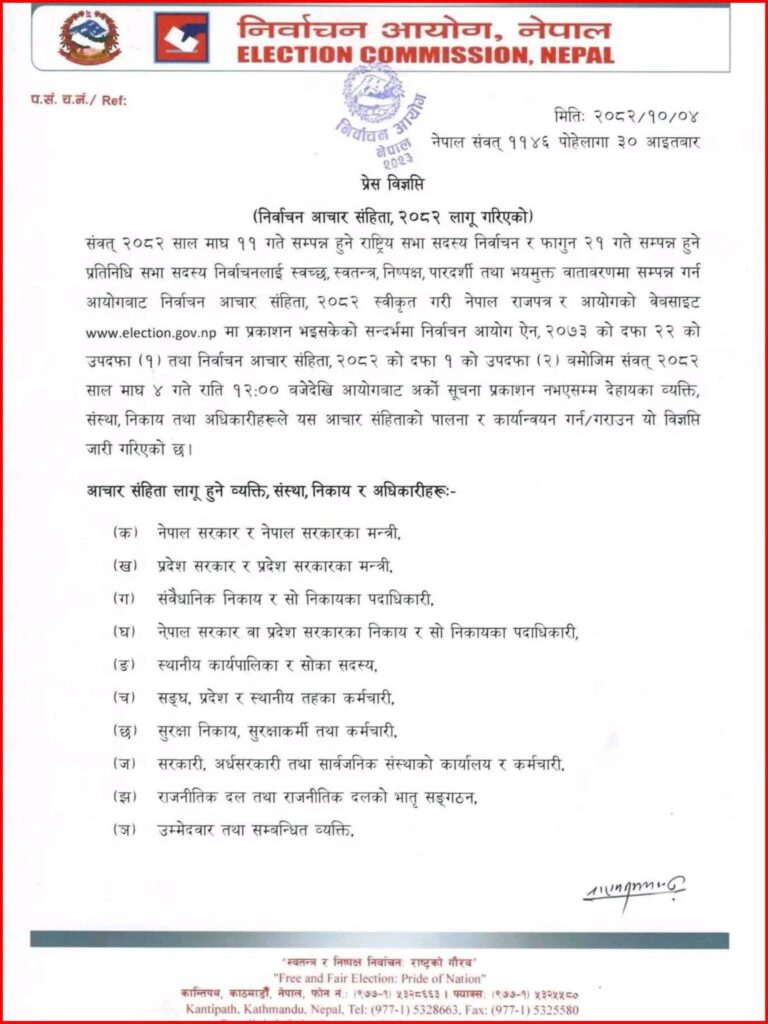 काठमाडौं । निर्वाचन आयोगले २०८२ माघ ५ गते बिहानदेखि राति १२ बजेपछि निर्वाचन आचारसंहिता लागु गर्ने भएको छ ।