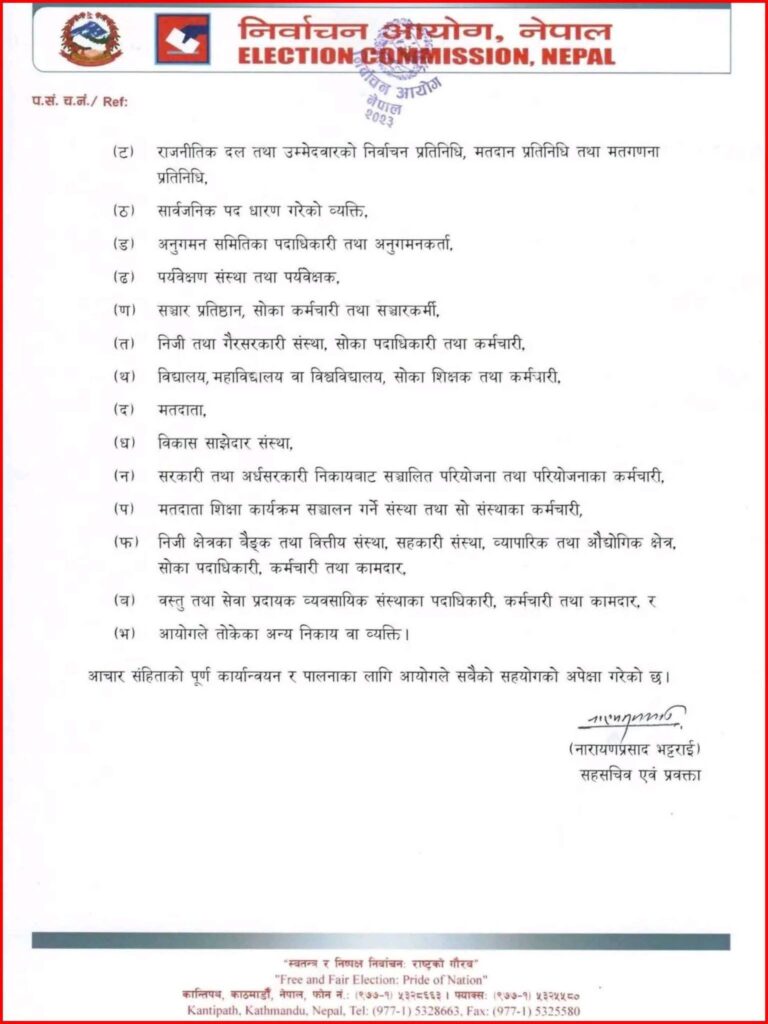 निर्वाचनमा स्वतन्त्रता, स्वच्छता, निष्पक्षता, पारदर्शिता, मितव्ययिता तथा भयमुक्त वातावरण कायम राख्न आवश्यक भएकाले निर्वाचन आयोग ऐन, २०७३ को दफा २२ ले दिएको अधिकार प्रयोग गरी आयोगले आचारसंहिता बनाई लागु गरेको आयोगले जनाएको छ ।