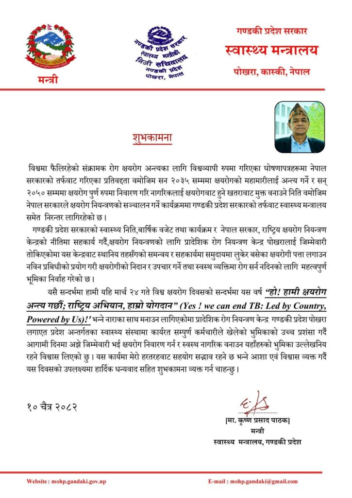 गण्डकी प्रदेश सरकार, स्वास्थ्य मन्त्रालय अन्तर्गत प्रादेशिक रोग नियन्त्रण केन्द्र, पोखराको आयोजनामा सम्पन्न कार्यक्रममा बोल्दै स्वास्थ्य मन्त्री कृष्णप्रसाद पाठकले क्षयरोगको पहिचान, नियन्त्रण र उन्मूलनका लागि सरकार प्रतिबद्ध रहेको बताउनु भयो ।