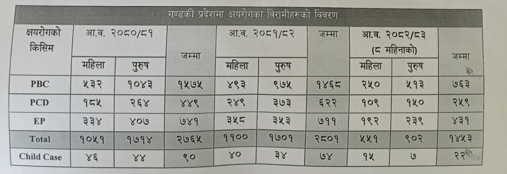 गण्डकी प्रदेशमा प्रत्येक वर्ष करिब ५ हजार ५ सय क्षयरोगका नयाँ बिरामी हुने अनुमान गरिए पनि चालु आर्थिक वर्षमा २ हजार ८ सय १ जना मात्रै उपचारमा आएको तथ्याङ्क सार्वजनिक गरिएको छ । कास्की र नवलपरासी जिल्लामा सबैभन्दा बढी बिरामी फेला परेका छन् ।