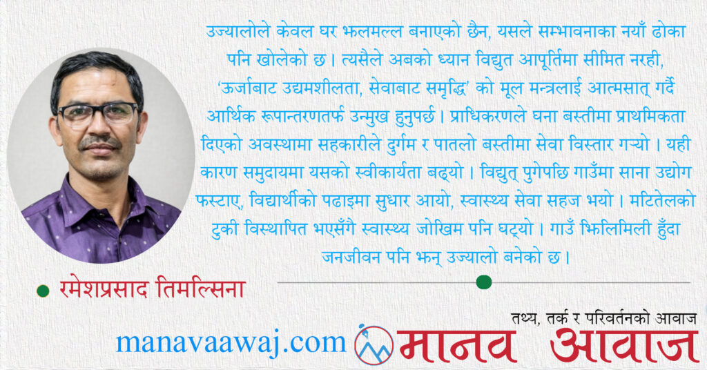 अबको चरणमा विद्युतलाई उत्पादनशील क्षेत्रमा उपयोग गर्दै स्थानीय नागरिकलाई उद्यमशील बनाउन आवश्यक छ । साना तथा मझौला उद्योग, कृषि प्रशोधन, पर्यटन सेवा, सूचना प्रविधिलगायतका क्षेत्रमा ऊर्जा प्रयोग गरी रोजगारी सिर्जना गर्नु पर्छ । सहकारी संस्थाले गुणस्तरीय सेवा, सिप विकास र लगानी सहजीकरणमार्फत सदस्यहरूलाई उद्यमशील यात्रामा अगाडि बढाउन भूमिका खेल्नुपर्छ । यसरी ऊर्जा र सेवाको प्रभावकारी उपयोगले मात्र दिगो समृद्धि हासिल गर्न सकिन्छ र उज्यालो गाउँलाई समृद्ध समाजमा रूपान्तरण गर्न सकिन्छ ।