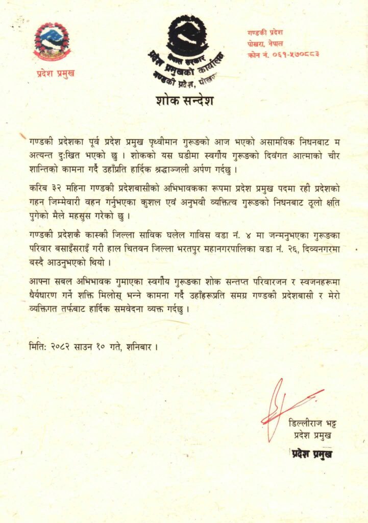 उहाँको निधनमा गण्डकी प्रदेशका प्रमुख डिल्लीराज भट्टले एक शोक सन्देश जारी गर्दै दुःख व्यक्त गर्नु भएको छ ।