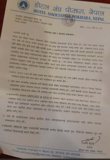 जेन–जी आन्दोलनबाट प्रत्यक्ष प्रभावित होटल प्रतिष्ठानहरूको पुनरुत्थानका लागि उचित राहत व्यवस्था गर्नुपर्ने र पोखरासँग जोडिएका मुख्य राजमार्गहरूको स्तरोन्नति कार्य तोकिएको समयमै सम्पन्न गर्न सम्बन्धित निकायलाई दबाब दिनुपर्ने विषय पनि ध्यानाकर्षणपत्रमा समेटिएको छ ।
