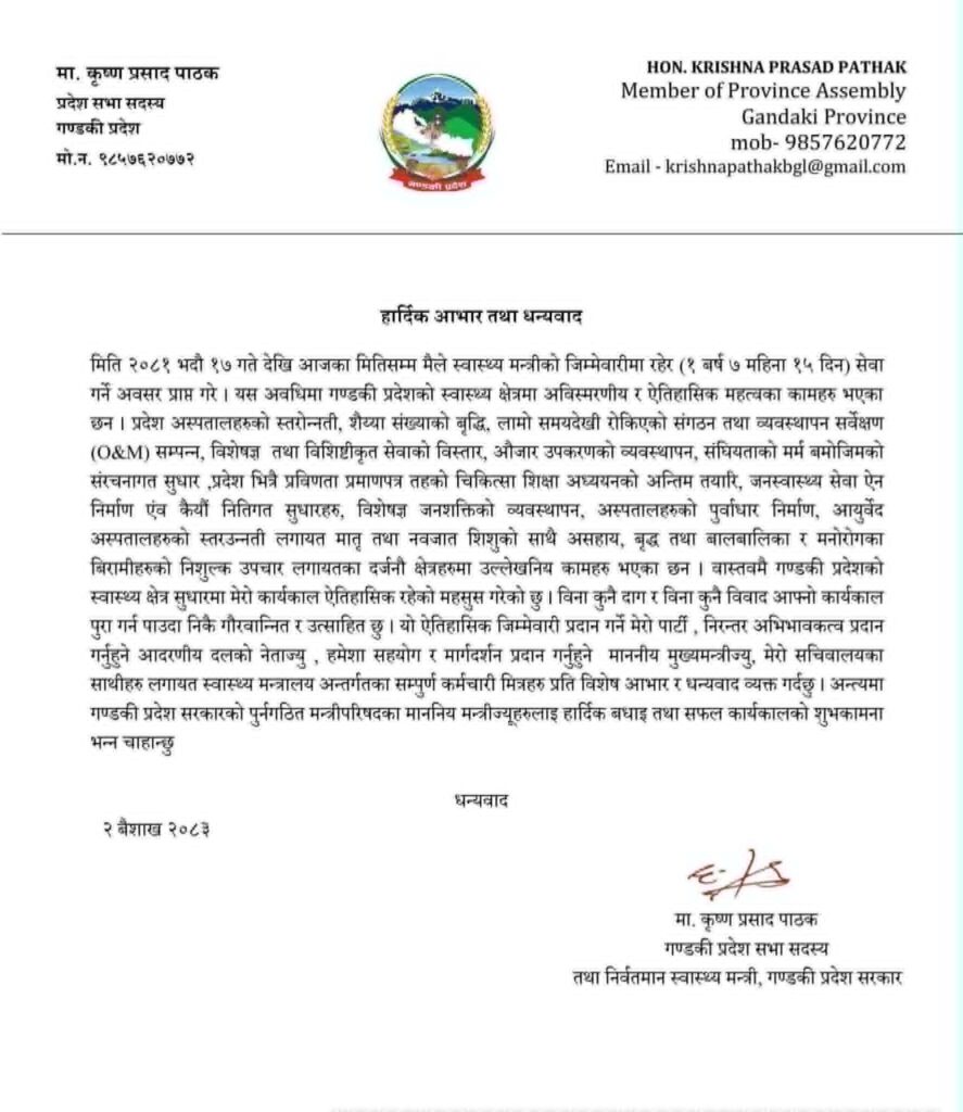 पाठकले एक विज्ञप्ति जारी गर्दै १ वर्ष ५ महिना १५ दिनको अवधिमा स्वास्थ्य मन्त्रालय सम्हाल्ने अवसर पाएको र यस अवधिमा गण्डकी प्रदेशको स्वास्थ्य क्षेत्रमा महत्वपूर्ण तथा दीर्घकालीन प्रभाव पार्ने कामहरू सम्पन्न गरिएको उल्लेख गर्नुभएको छ ।