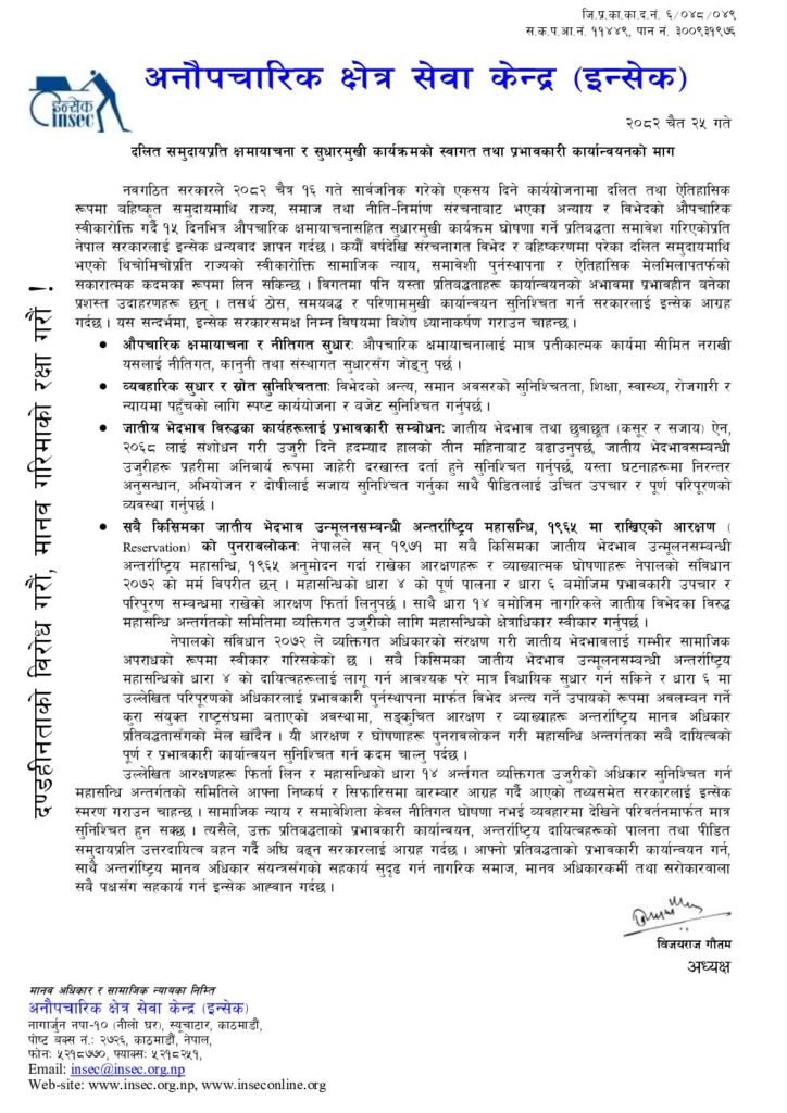 इन्सेकले बुधबार जारी गरेको विज्ञप्तिमा विभेद अन्त्य, समान अवसर सुनिश्चितता तथा शिक्षा, स्वास्थ्य, रोजगारी र न्यायमा पहुँच विस्तारका लागि स्पष्ट कार्ययोजना र बजेट सुनिश्चित गर्न सरकारलाई आग्रह गरिएको छ ।