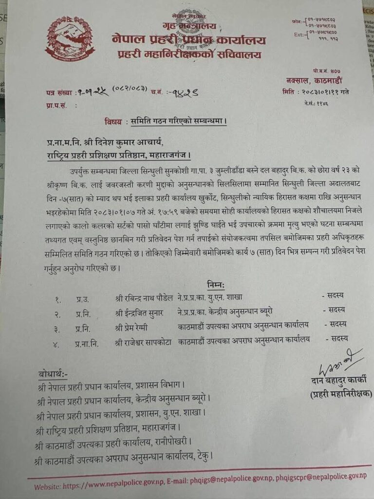 प्रहरी हिरासतमा रहेका एक दलित युवाको मृत्यु भएको घटनाबारे छानबिन गर्न प्रहरी प्रधान कार्यालयले समिति गठन गरेको छ ।