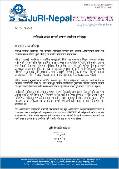 जुरी–नेपालले स्वास्थ्य सेवाको गुणस्तर र पहुँच सुधार नर्सहरूको अधिकारसँग प्रत्यक्ष रूपमा जोडिएको बताउँदै, नेपालको संविधानको धारा ३५ ले प्रत्याभूत गरेको ‘प्रत्येक नागरिकको गुणस्तरीय स्वास्थ्य सेवाको हक’ सुनिश्चित गर्न नर्सहरूको माग सम्बोधन अनिवार्य भएको धारणा व्यक्त गरेको छ ।