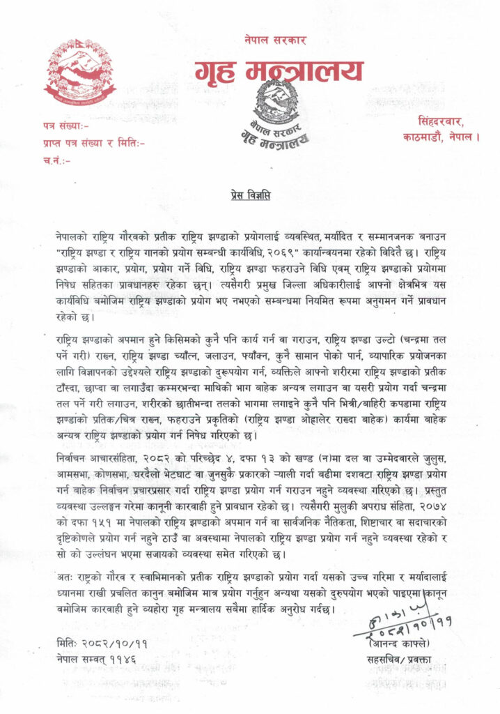 मन्त्रालयले आज विज्ञप्ति जारी गरी भनेको छ, ‘राष्ट्रको गौरव र स्वाभिमानको प्रतीक राष्ट्रिय झण्डाको प्रयोग गर्दा यसको उच्च गरिमा र मर्यादालाई ध्यानमा राखी प्रचलित कानुनबमोजिम मात्र प्रयोग गर्नु होला, अन्यथा यसको दुरुपयोग भएको पाइएमा कानुनबमोजिम कारबाही हुने व्यहोरा गृह मन्त्रालय सबैमा हार्दिक अनुरोध गर्दछ ।’