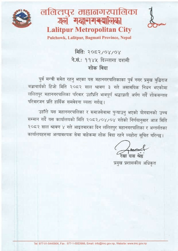 पूर्व नगर प्रमुख बुद्धिराज बज्राचार्यको निधनमा महानगरले सूचना प्रकाशित गरी शोक बिदा दिएको हो ।