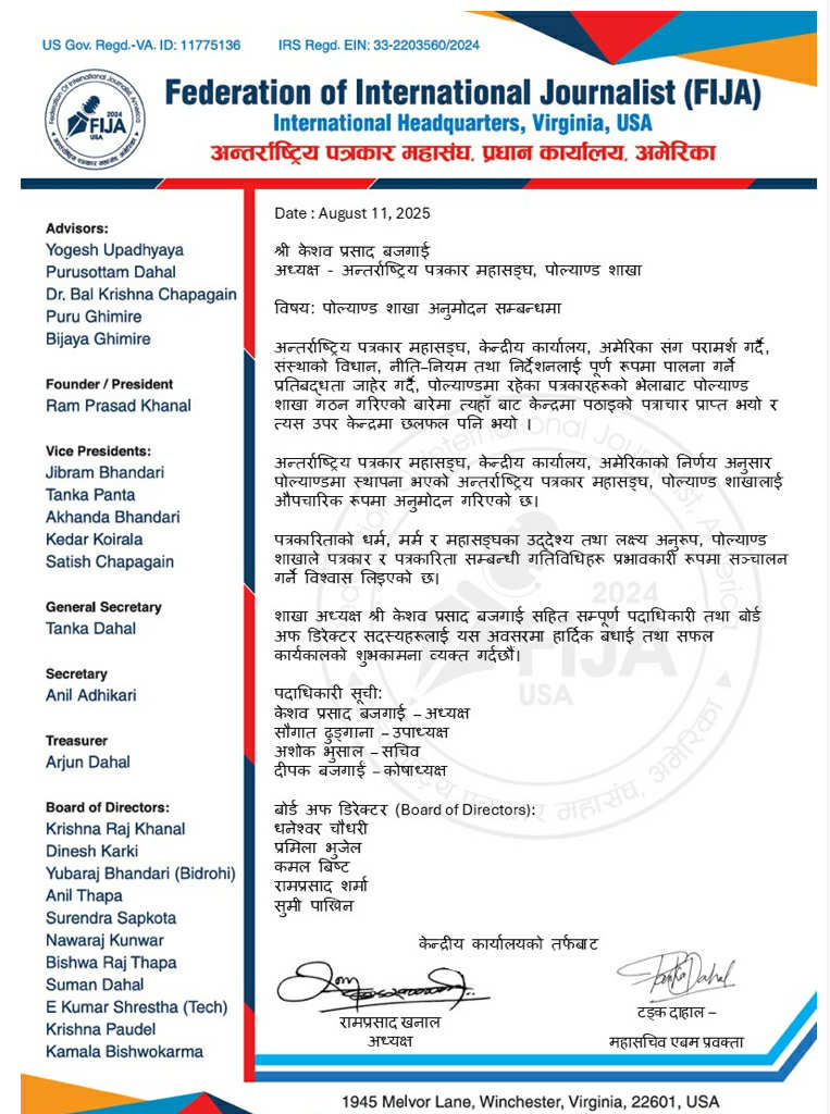 ललितपुर । विश्वभर छरिएर रहेका पत्रकारहरुलाई एकीकृत गर्ने उद्देश्यका साथ, आम सञ्चारकर्मीहरूको हक र हितका लागि सङ्गठित रुपमा आवाज उठाउँदै आएको अन्तर्राष्ट्रिय पत्रकार महासङ्घ पोल्यान्डको अध्यक्षमा सङ्गम दैनिकका प्रधान सम्पादक ललितपुरका केशवप्रसाद बजगाई निर्विरोध निर्वाचित हुनुभएको छ ।