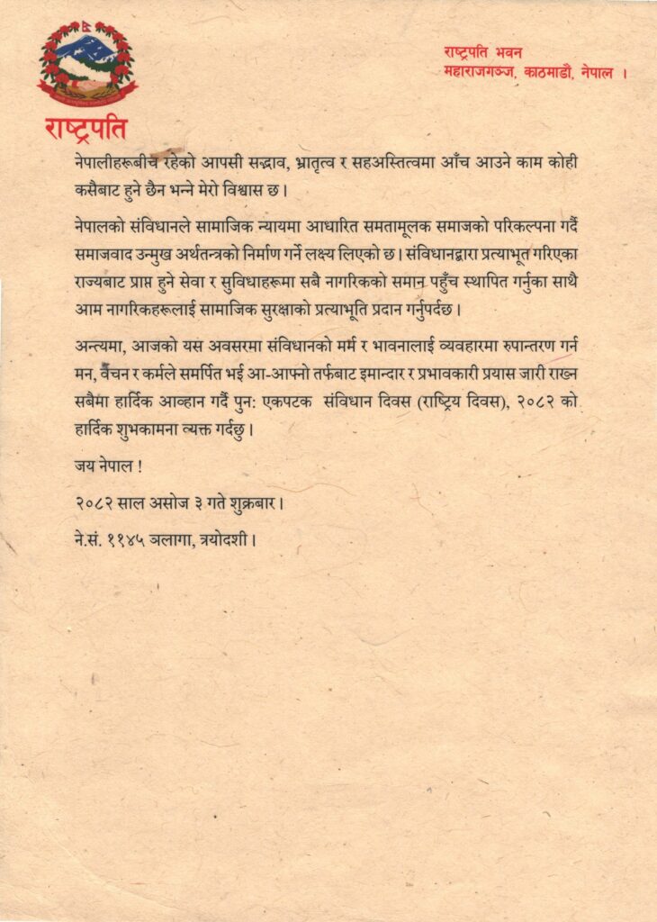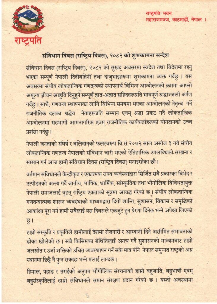 संविधान दिवसका अवसरमा २०८२ असोज ३ गते शुभकामना सन्देश दिँदै राष्ट्रपति पौडेलले नेपालको संविधानले सामाजिक न्यायमा आधारित समतामूलक समाजको परिकल्पना गर्दै समाजवाद उन्मुख अर्थतन्त्रको निर्माण गर्ने लक्ष्य लिएको उल्लेख गर्नु भएको छ ।