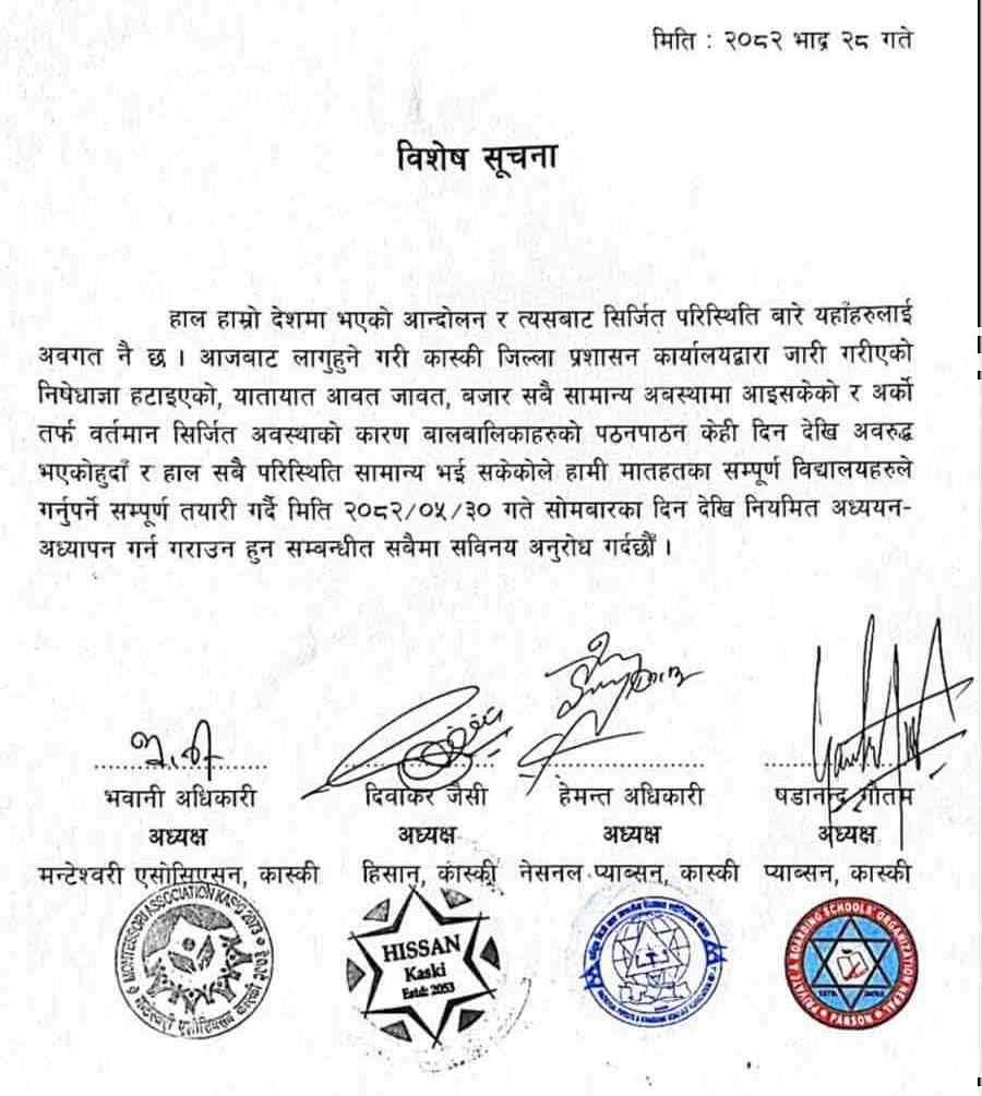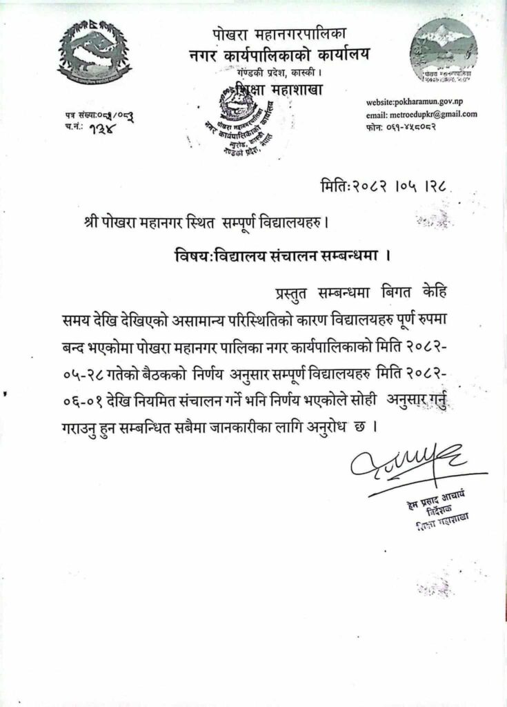 लामो समयदेखि देखिएको असामान्य परिस्थितिका कारण पूर्णरूपमा बन्द रहेका विद्यालयहरूलाई पोखरा महानगरपालिका, नगर कार्यपालिकाको २०८२ भदौ २८ गते बसेको बैठकले असोज १ गतेदेखि सञ्चालन गर्ने निर्णय गरेको हो ।