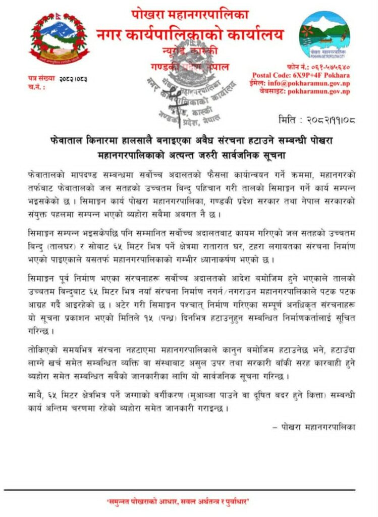 पोखरा महानगरपालिकाले यसअघि २०८२ फागुन ८ गते १५ दिने सूचना जारी गर्दै मापदण्डविपरीत निर्माण भएका सबै संरचना तोकिएको समयभित्र स्वयम् हटाउन निर्देशन दिएको थियो ।