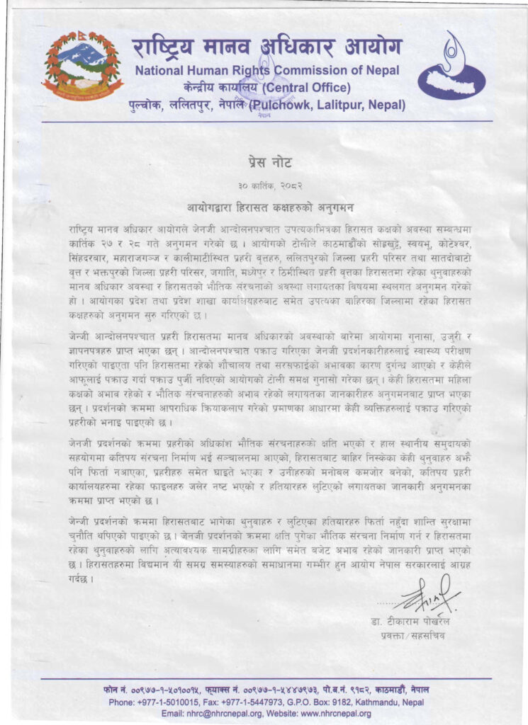 ललितपुर । राष्ट्रिय मानव अधिकार आयोगले जेन्जी आन्दोलनपश्चात उपत्यकाभित्रका विभिन्न प्रहरी हिरासत कक्षहरूको अवस्था अनुगमन गरेको छ ।