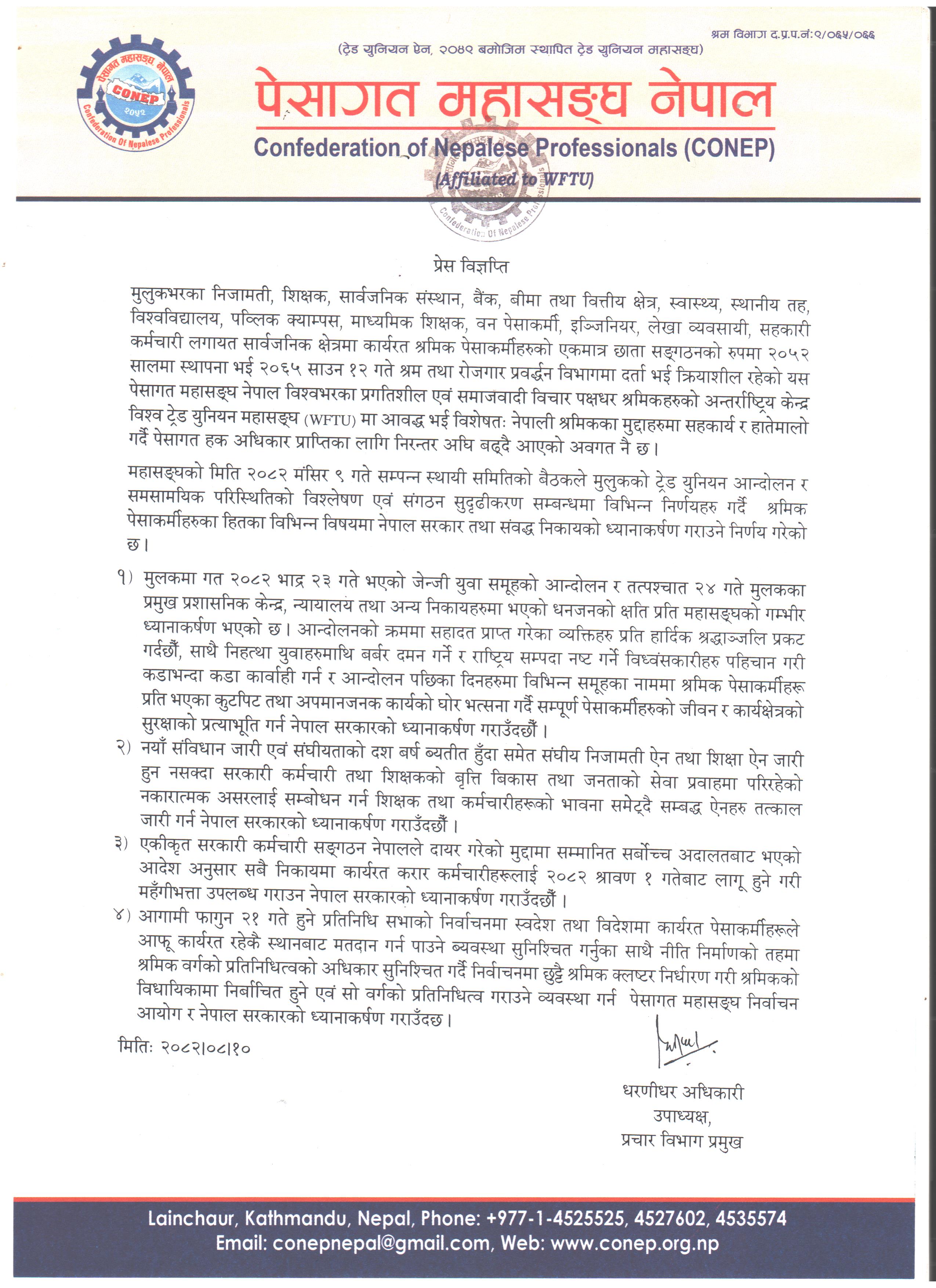 महासङ्घका उपाध्यक्ष तथा प्रचार विभाग प्रमुख धरणीधर अधिकारीद्वारा जारी विज्ञप्तिमा २०८२ भदौ २३ र २४ गतेको घटनाक्रममा भएको धनजनको क्षतिप्रति महासङ्घले गम्भीर चासो व्यक्त गरेको छ ।