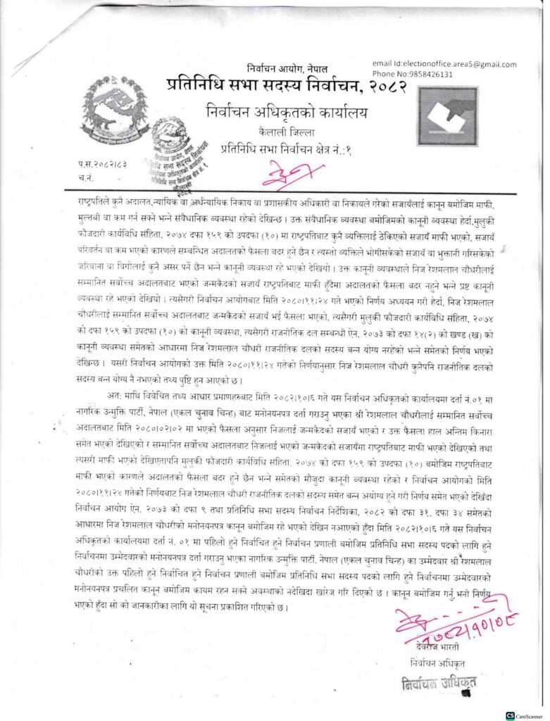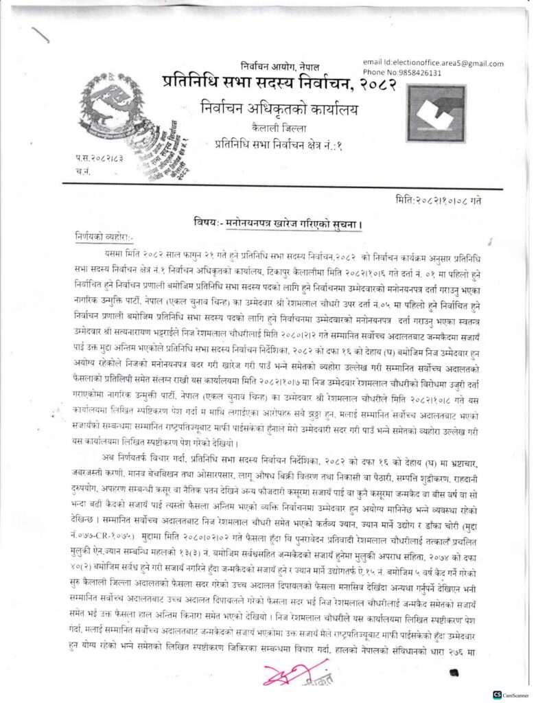 कर्तव्य ज्यान मुद्दामा दोषी ठहर भएर जेल सजायसमेत भोगिसक्नु भएका चौधरीको उम्मेदवारी निर्वाचन आयोगले २०८२ माघ ८ गते खारेज गरिदिएको हो ।