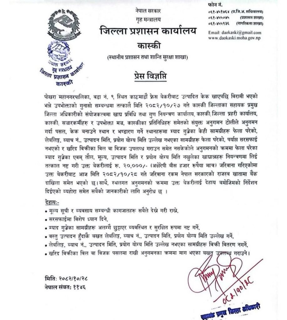 जिल्ला प्रशासन कार्यालय कास्कीका अनुसार पोखरा महानगरपालिका–९ महेन्द्रपुलस्थित काठमाडौं फ्रेश बेकरीले उत्पादन गरेको केक खाँदा एक उपभोक्ता बिरामी परेपछि अनुगमन गरिएको थियो ।