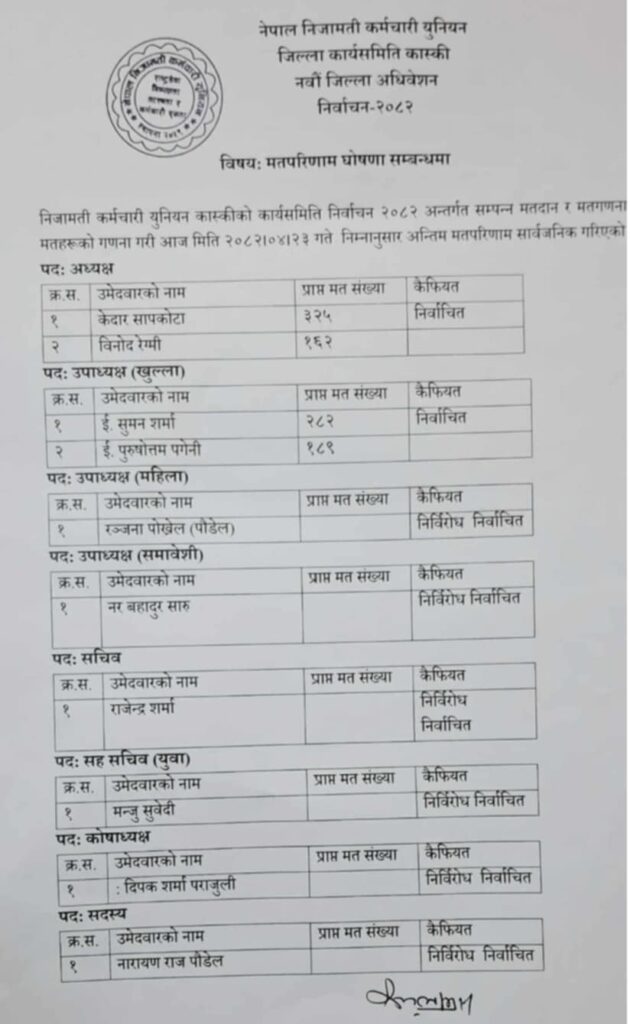 पोखरा । नेपाल निजामती कर्मचारी युनियन, कास्कीको नवौं जिल्ला अधिवेशनले केदार सापकोटाको अध्यक्षतामा नयाँ कार्यसमिति चयन गरेको छ ।