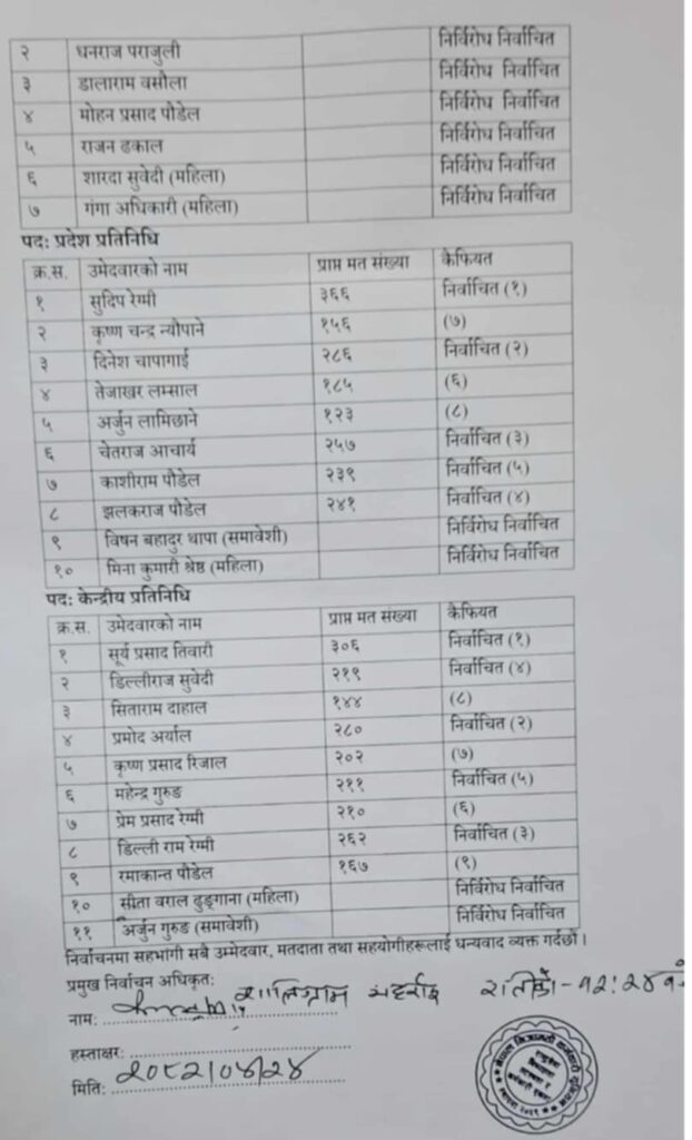 त्यसैगरी, खुल्लातर्फको उपाध्यक्ष पदमा सुमन शर्मा २ सय ८२ मतका साथ निर्वाचित हुनु भयो । उहाँका प्रतिस्पर्धी पुरुषोत्तम पौडेलले १ सय ८९ मत प्राप्त गर्नु भयो ।