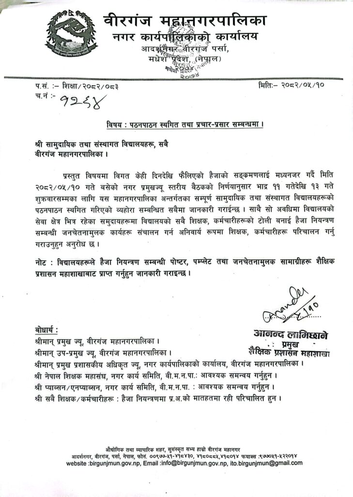 जनकपुरधाम । पर्साको वीरगञ्ज महानगरपालिकाभित्रका विद्यालयहरू भदौ १३ सम्म बन्द गरिने भएको छ ।