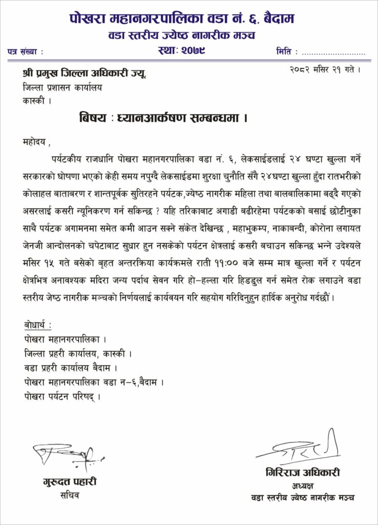 पोखरा । पोखरा महानगरपालिका–६ स्थित वडा स्तरीय जेष्ठ नागरिक मञ्च बैदामले २०८२ मङ्सिर २१ गते कास्कीकी प्रमुख जिल्ला अधिकारी रुद्रादेवी शर्मालाई ध्यानाकर्षण पत्र बुझाएको छ ।