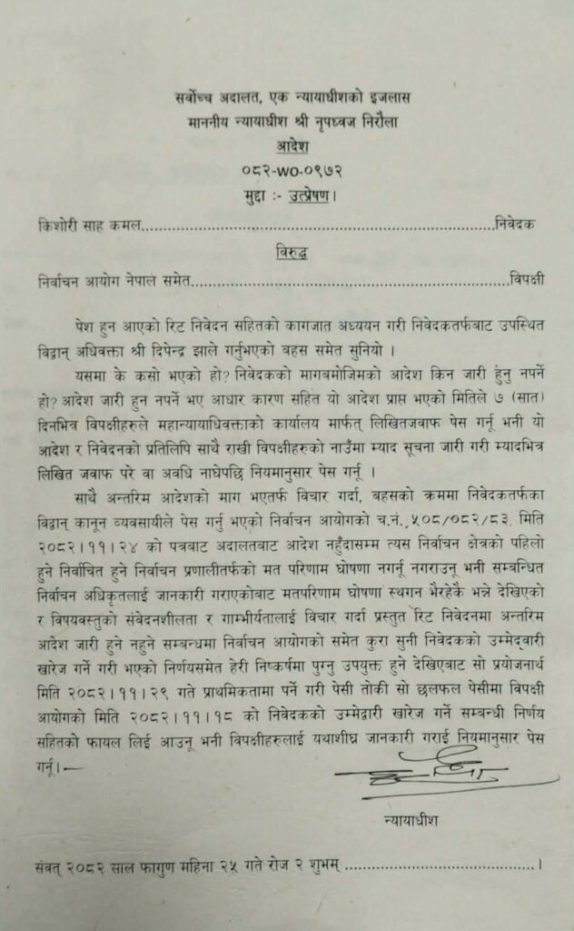 काठमाडौँ । सर्वोच्च अदालतले निर्वाचन आयोगद्वारा उम्मेदवारी खारेज गरिएका धनुषा क्षेत्र नम्बर १ का रास्वपाका उम्मेदवार किशोरी साह कमलको रिटमा सुनुवाइ गर्दै निर्वाचन आयोगका नाममा कारण देखाऊ आदेश जारी गरेको छ । न्यायाधीश नृपध्वज निरौलाको एकल इजलासले सोमबार सो आदेश जारी गरेको हो ।