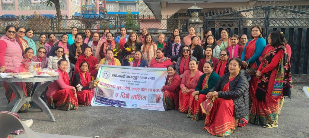 पोखरा । “ऐक्यबद्धता, सभ्यता र हिंसामुक्त समाजः हाम्रो अभियान” भन्ने मूल नारासहित २०७५ सालमा स्थापित हातेमालो नागढुङ्गा आमा समूह, पोखरा महानगरपालिका–८, नागढुङ्गा, कास्कीको आयोजनामा तथा पोखरा महानगरपालिकाको सामाजिक विकास महाशाखाको आर्थिक सहयोगमा सीपमूलक तालिम सञ्चालन भइरहेको छ ।
