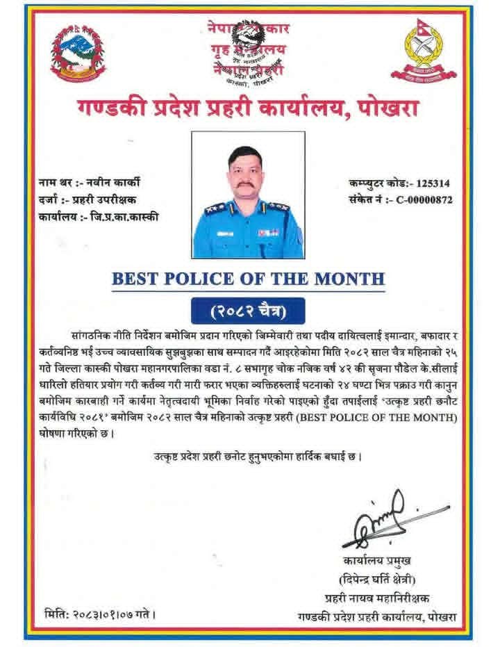 पोखरा । गण्डकी प्रदेश प्रहरी कार्यालय, पोखराले प्रदेश मातहत ११ जिल्ला मध्येबाट कास्की जिल्लाका प्रहरी उपरीक्षक नवीन कार्कीलाई २०८२ चैत महिनाको उत्कृष्ट प्रहरी घोषणा गर्दै पुरस्कारबाट सम्मानित गरेको छ ।