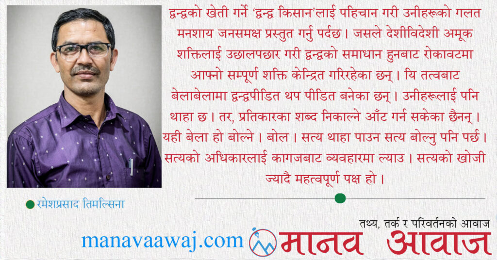 द्वन्द्वको खेती गर्ने ‘द्वन्द्व किसान’लाई पहिचान गरी उनीहरूको गलत मनशाय जनसमक्ष प्रस्तुत गर्नु पर्दछ । जसले देशीविदेशी अमूक शक्तिलाई उछालपछार गरी द्वन्द्वको समाधान हुनबाट रोकावटमा आफ्नो सम्पूर्ण शक्ति केन्द्रित गरिरहेका छन् । यहाँ द्वन्द्व किसान मात्रै छैनन् ‘द्वन्द्व उद्यमी’ पनि छन् । जसको उत्पादन नै मिल्न मिलाउन लागिएको कामलाई भत्काएर थप द्वन्द्व सिर्जना गर्नु हो । यिनीहरूको पहुँच समुन्द्र पारसम्म पनि छ । यि तत्वबाट बेलाबेलामा द्वन्द्वपीडित थप पीडित बनेका छन् । उनीहरूलाई पनि थाहा छ । तर प्रतिकारका शब्द निकाल्ने आँट गर्न सकेका छैनन् । यही बेला हो बोल्ने । बोल । सत्य थाहा पाउन सत्य बोल्नु पनि पर्छ । सत्यको अधिकारलाई कागजबाट व्यवहारमा ल्याउ । सत्यको खोजी ज्यादै महत्वपूर्ण पक्ष हो ।
