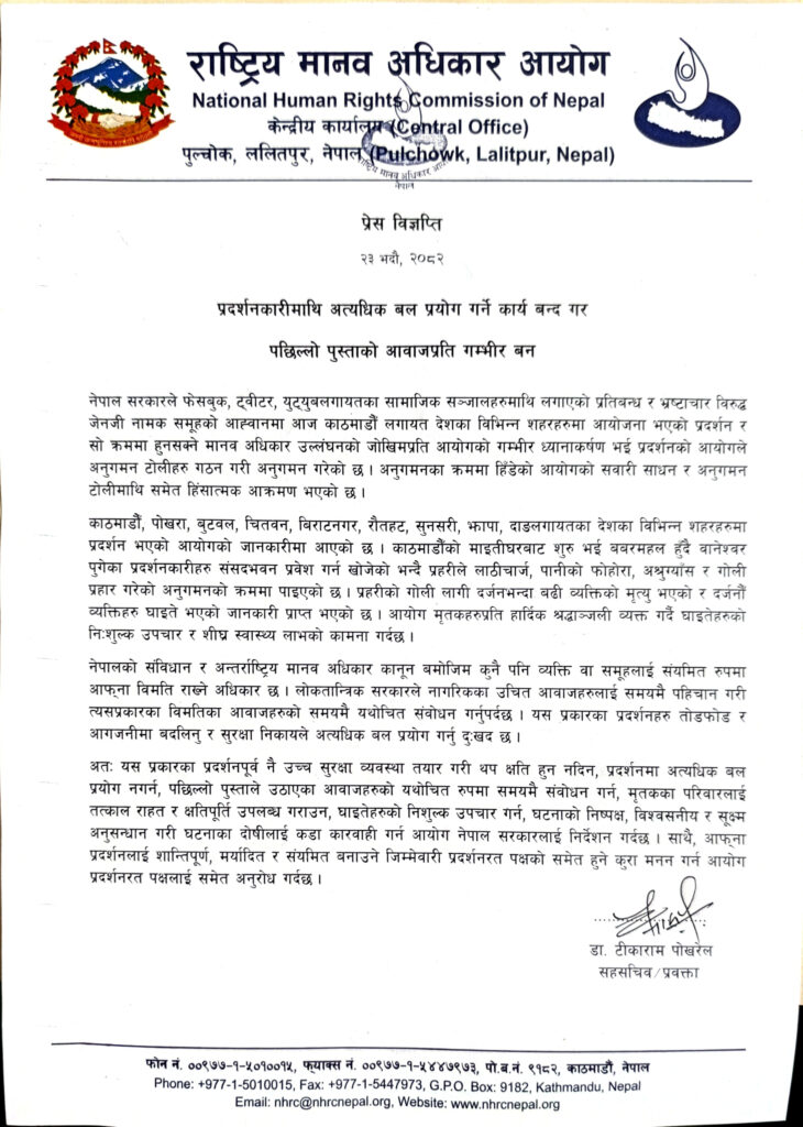 “नेपालको संविधान र अन्तर्राष्ट्रिय मानव अधिकार कानुनअनुसार नागरिकलाई शान्तिपूर्ण रूपमा आफ्नो विमति राख्ने अधिकार सुरक्षित छ । सरकार जिम्मेवार भएर त्यसलाई सम्बोधन गर्नुपर्छ ।”-विज्ञप्तिमा भनिएको छ ।