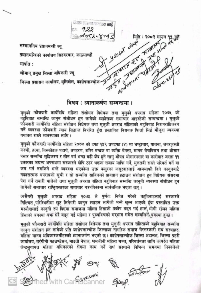 बहुविवाहलाई निश्चित परिस्थितिमा वैधता दिने कानुनी मस्यौदाको विरोधमा काभ्रेपलाञ्चोक जिल्लाका महिलाअधिकारकर्मीहरूले प्रधानमन्त्रीलाई ज्ञापनपत्र बुझाएका छन्।