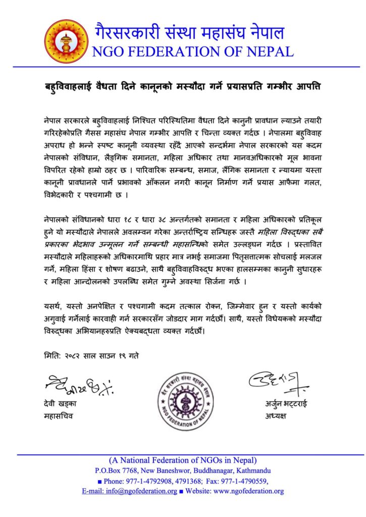 नेपाल सरकारले बहुविवाहलाई निश्चित परिस्थितिमा वैधता दिने कानुनको मस्यौदा तयार गर्ने प्रयास गरिरहेकोप्रति गैसस महासङ्घ नेपालले गम्भीर आपत्ति र चिन्ता व्यक्त गरेको छ।