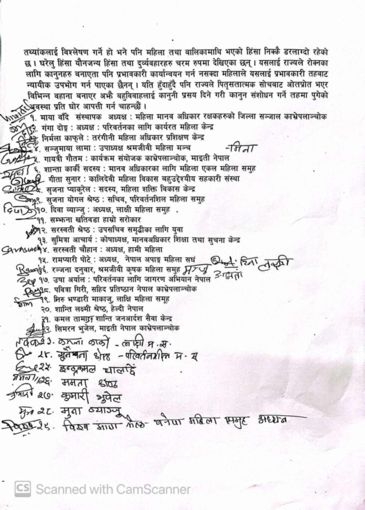 “पहिले भएका कानुनहरू कार्यान्वयन गर्न नसकिएको स्थितिमा अझ नयाँ विभेदकारी कानुनी प्रावधान ल्याउनु महिला अधिकार र न्यायको पक्षमा होइन ।”-ज्ञापनपत्रमा भनिएको छ।