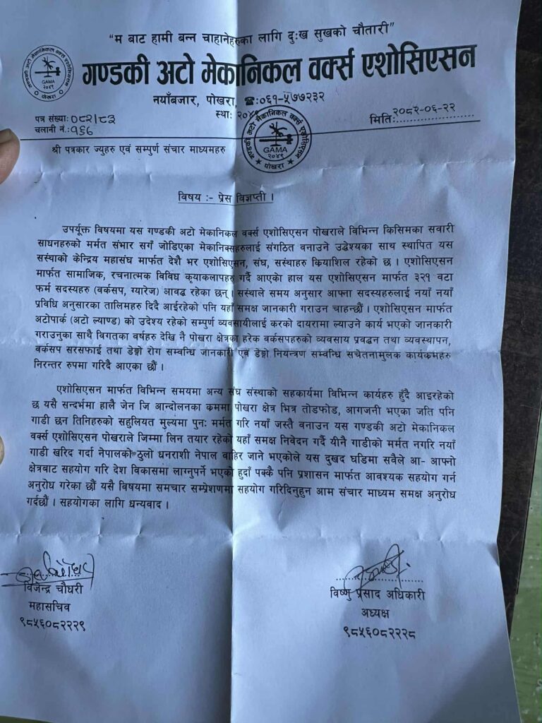 पोखरा । गण्डकी अटो मेकानिकल वर्क्स एशोसिएसन, पोखराले हालैको जेनजी आन्दोलनका क्रममा आगजनीबाट ध्वस्त बनेका सवारीसाधनहरू मर्मतसम्भार गरी नयाँजस्तै बनाउने प्रस्तावसहित ज्ञापनपत्र बुझाएको छ ।