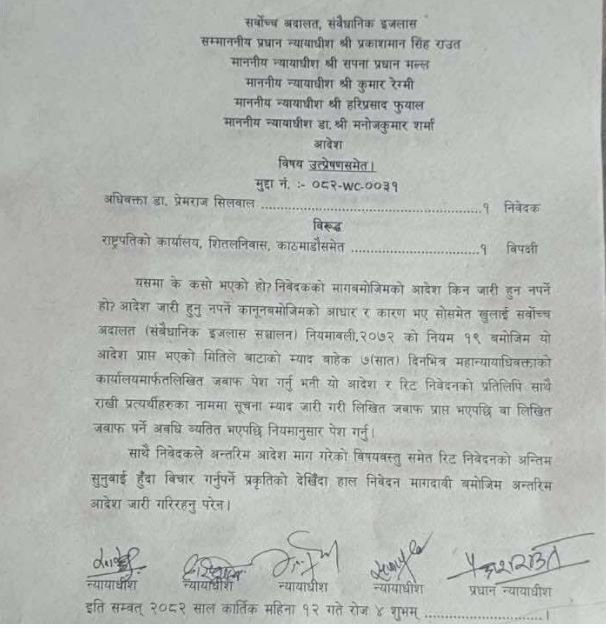 पाँच सदस्यीय संवैधानिक इजलासले मुद्दाको अन्तिम सुनुवाइका बखत नै माग दाबीका बारेमा छलफल हुने भन्दै अहिलेलाई अन्तरिम आदेश दिन अस्वीकार गरेको हो ।