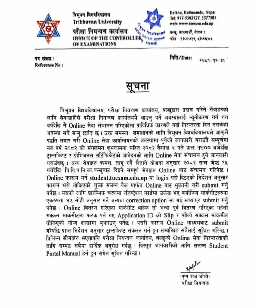 आगामी जेठ १५ गतेबाट त्रिभुवन विश्वविद्यालय परीक्षा नियन्त्रण कार्यालय बल्खुबाट दिइने सम्पूर्ण सेवाहरू अनलाइनबाट नै सञ्चालन हुने जनाइएको छ ।