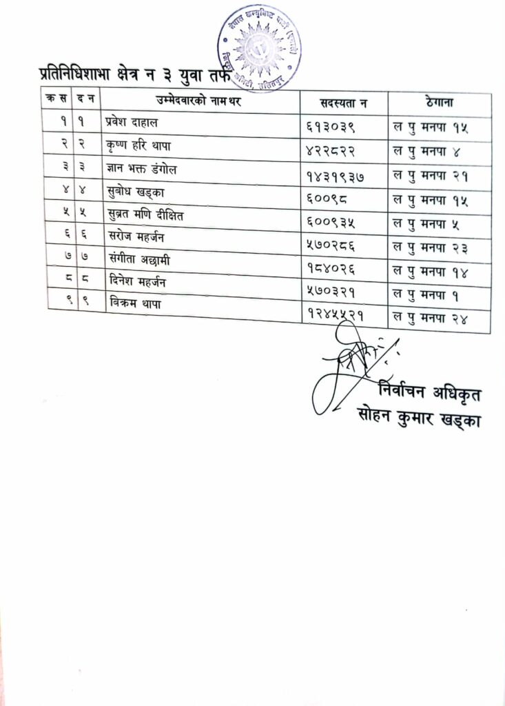 यस्तै महिलातर्फ सरस्वती खड्का,कमला थापा,चन्द्रकला घिमिरे,शशिकला सुवेदी र सुकुमाया लामा रहनु भएको छ भने युवातर्फ प्रवेश दाहाल,कृष्णहरि थापा, ज्ञानभक्त डङ्गोल, सुबोध खड्का,सुव्रतमणि दिक्षित, सरोज महर्जन,सङ्गीता अछामी,दिनेश महर्जन र विक्रम थापाले उम्मेदवारी दर्ता गर्नु भएको छ ।