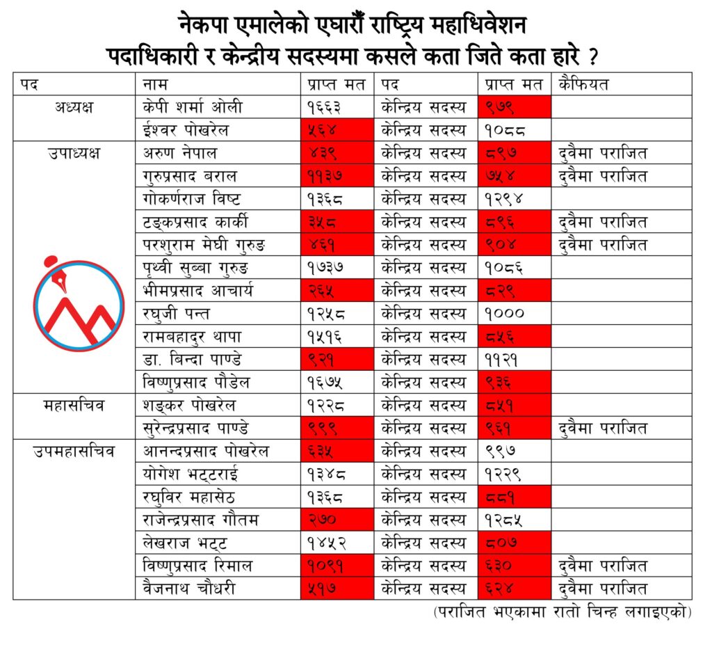 महाधिवेशनको अन्तिम मतपरिणामअनुसार गोकर्ण विष्ट र योगेश भट्टराईबाहेक निर्वाचित पदाधिकारी तथा केन्द्रीय सदस्य ओलीकै प्यानलबाट आएका छन् ।