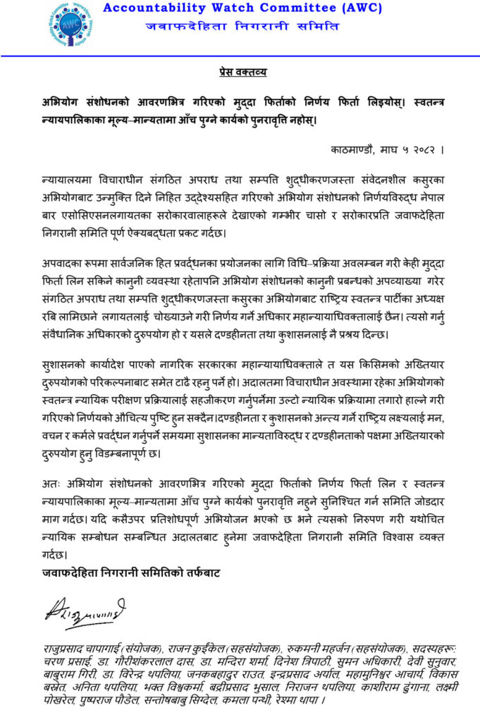 समितिले अभियोग संशोधनको आवरणमा गरिएको मुद्दा फिर्ताको निर्णय तत्काल फिर्ता लिन र भविष्यमा स्वतन्त्र न्यायपालिकाको गरिमामा आँच पुग्ने यस्ता कार्य दोहोरिन नदिने सुनिश्चितता गर्न जोडदार माग गरेको छ ।
